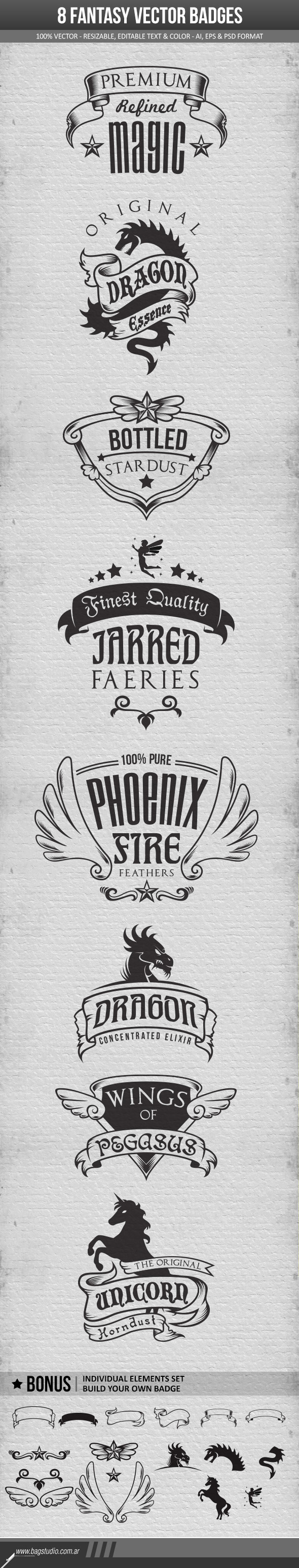 Set of 8 fantasy theme vector badges. 100% vector. Fully resizable with editable text. AI, EPS & PSD file formats available. Free fonts used listed in readme file